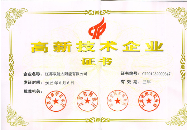 日前,江蘇雙能太陽能有限公司又傳喜訊,雙能公司榮獲由江蘇省科學技術廳、江蘇省財政廳、江蘇省國家稅務局、江蘇省地方稅務局聯合頒發的“高新技術企業”證書。