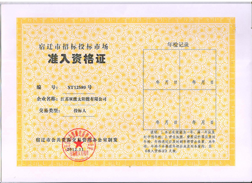 雙能太陽能獲宿遷市招標(biāo)投標(biāo)市場(chǎng)準(zhǔn)入資格證