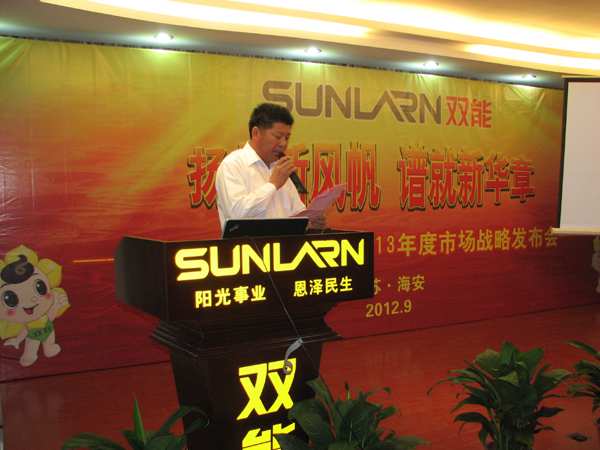 董事長首先為大會致辭,對遠道而來的經銷商朋友表示熱烈的歡迎及衷心地感謝。董事長表示愿以雙能品牌的大發展為紅線,凝聚各地雙能經銷商的共同智慧、共創雙能品牌的美好明天,與經銷商朋友共同抒寫“陽光事業,恩澤民生”的壯麗篇章。并表示,這次會議將是雙能歷史上頗具紀念意義的一次會議,是雙能實現二次創業的轉折點。