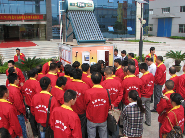 賁總與經銷商分享了工程市場操作的經驗。之后,雙能工作人員向經銷商朋友現場演示了雙能智動波太陽能節水、節電、開閥出熱水、定量加熱、管道防凍、增壓等功能。并帶領經銷商參觀了生產車間。