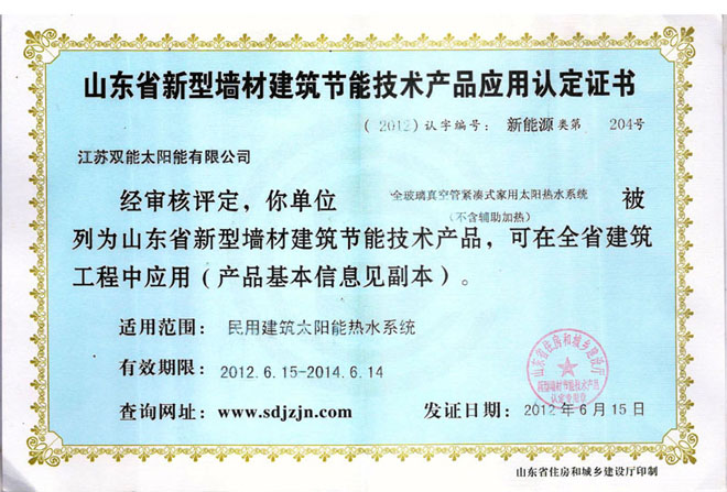 雙能獲得該證書,證明雙能太陽能產品符合與該種產品有關的質量、安全和環境保護等方面的標準要求,與同類產品或相同功能的產品相比,效率或能耗指標達到省及省以上先進水平,且在山東省之后的建筑應用中,會被優先推廣。該證書的獲得,對雙能產品在山東省的推廣起到了積極的推進作用,也為消費者選購太陽能提供了一個更為放心的選擇。