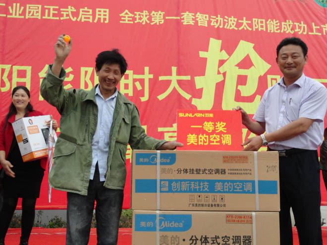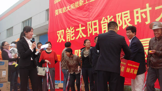 為了慶祝雙能太陽能新工業(yè)園正式啟用以及全球第一套智動波太陽能成功上市,雙能太陽能特于5月13日舉辦限時大搶購活動,借此機會回饋海安廣大人民,對海安人民多年來對雙能公司的支持與厚愛表示感謝。在海安縣所有經(jīng)銷商及公司抽調(diào)人員的積極努力下,經(jīng)過12天的預(yù)熱宣傳,活動當天場面異常火爆,銷售機器近千臺,達到了活動預(yù)期的效果。
