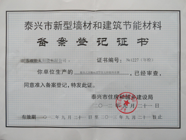 日前,江蘇雙能太陽能有限公司獲得由泰興市住房和城鄉(xiāng)建設(shè)局頒發(fā)的“泰興市新型墻材和建筑節(jié)能材料備案登記證書”,意即雙能整體式全玻璃真空管太陽能熱水器被納入泰興市建筑節(jié)能技術(shù)產(chǎn)品推廣范圍。