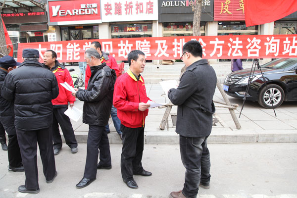以“太陽能常見故障及排除方法咨詢”為活動主題 ,雙能人提前制作了宣傳條幅,印制了科普宣傳單。還沒到中午,所有單頁就被熱心的市民們一搶而光。在前來咨詢的人們口中知道,太陽能存在的故障的確不少,有的冬天凍堵,有的樓頂上跑水,有的水溫不高,還有的加不滿水等等問題。