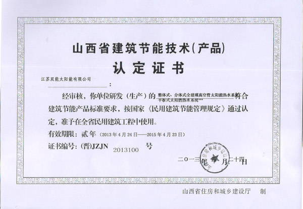 雙能獲得該證書,證明雙能太陽能產(chǎn)品符合與該種產(chǎn)品有關(guān)的質(zhì)量、安全和環(huán)境保護等方面的標(biāo)準要求,與同類產(chǎn)品或相同功能的產(chǎn)品相比,效率或能耗指標(biāo)達到省及省以上先進水平,且在山西省之后的建筑應(yīng)用中,會被優(yōu)先推廣。該證書的獲得,對雙能產(chǎn)品在山西省的推廣起到了積極的推進作用,也為消費者選購太陽能提供了一個更為放心的選擇。