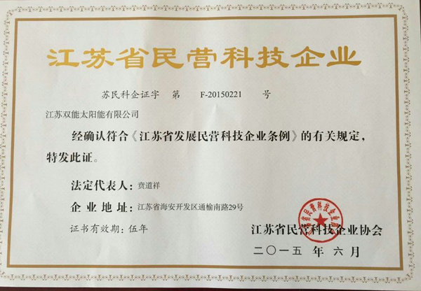 日前,雙能太陽能喜獲江蘇省民營科技企業(yè)證書。