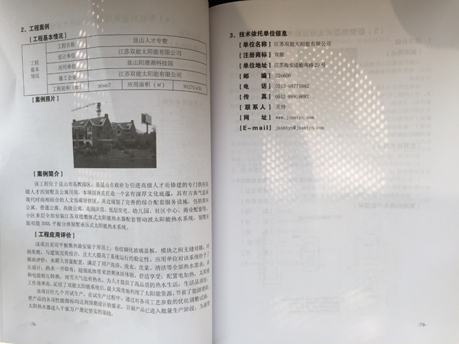 2015年10月,江蘇省住房和城鄉建設廳科技發展中心出版了《江蘇省建筑節能與綠色建筑示范工程重點技術(產品)推廣目錄(第三版)》,雙能太陽能入圍本目錄。